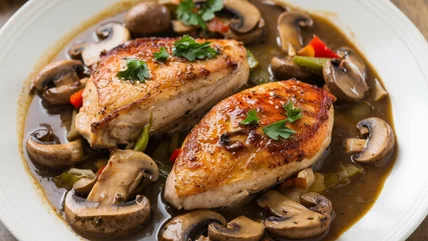 You'll brown the chicken first in a pan before it goes into the oven. Top it with the mushrooms, other ingredients, and the cheese at discussion and finish it off in the oven. It should take around six minutes for the dish to finish cooking and for the cheese to melt just enough. If you don't cook the chicken first, it'll take far longer in the oven. To finish it off, consider a garnish of parsley or green onions for a pop of color or a sprinkle of crushed red pepper for heat. Any leftover Marsala sauce can also be spooned on top for serving. And should you have any extra cheese, consider our classic cheese fondue recipe.
