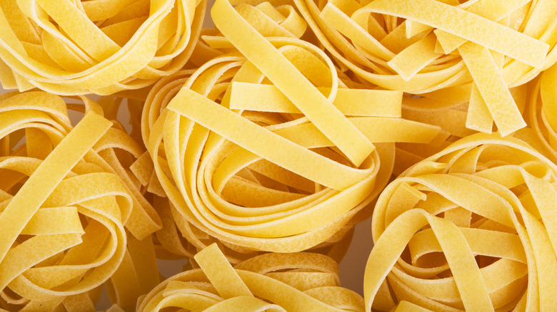 Both tagliolini and tagliatelle are types of long pastas conjugated from the Italian "tagliare," which means "to cut." Both pastas are also made from a dough of durum semolina flour and eggs, although tagliolini adds a splash of white wine into the mix and is more egg-yolk-heavy. Still, both tagliolini and tagliatelle can be dyed with ingredients like spinach, tomato, and saffron for vibrant, colorful hues.