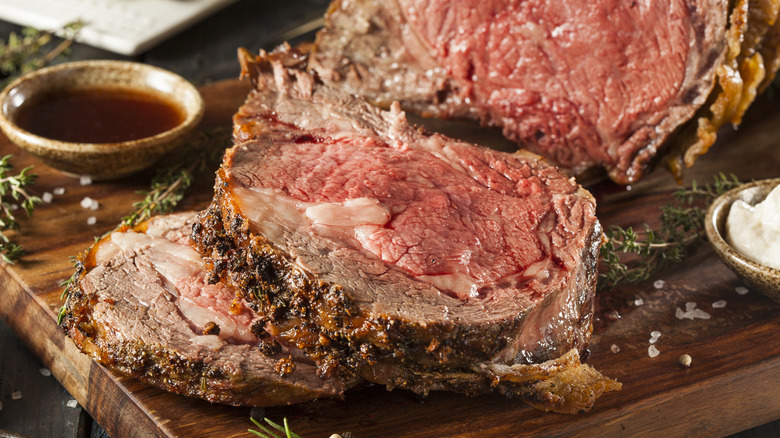 So you've brought home your perfect cut of prime rib — now what? No worries, as cooking this majestic hunk of beef is easier than you might think. If you went with the bone-in version, a classic recipe that rarely fails is to slow-roast the ribs in the oven with a blend of spices, including aromatic ground seasonings and tangy sumac, plus some fresh herbs. After a couple of hours, you'll have a gorgeous roast with an irresistible crust and juicy center that's ready to impress. If you want to take it up an extra notch, grate some fresh horseradish on top to pair with your prime rib and you've got an incredible dinner in the making.