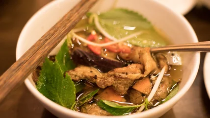 There are many warm, comforting Vietnamese dishes (that aren't pho), which still explode with flavor. The brothy delight known as bun cha, hailing from Hanoi, delivers a hearty plate of pork — meatballs and grilled slices of meat — floating in a broth. This dish is usually served with plates of cold vermicelli noodles, lettuce, fresh herbs, and pickled vegetables, letting each diner choose their own culinary adventure as to how to devour the compilation.