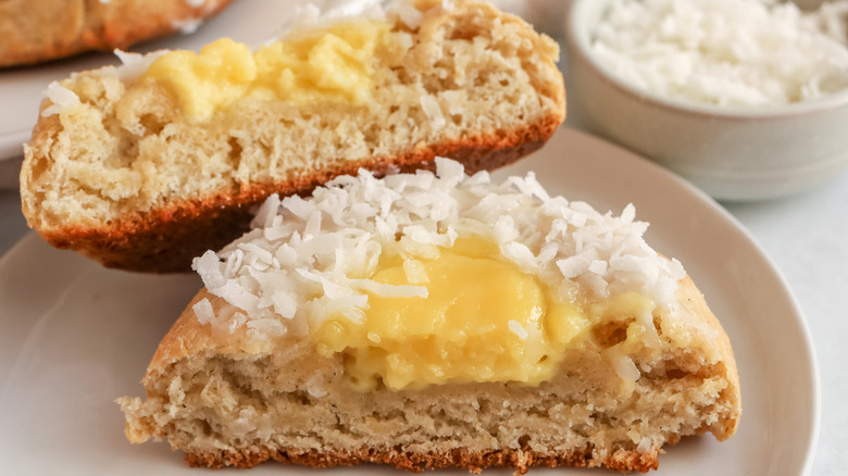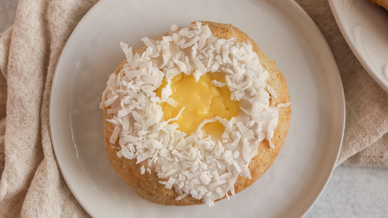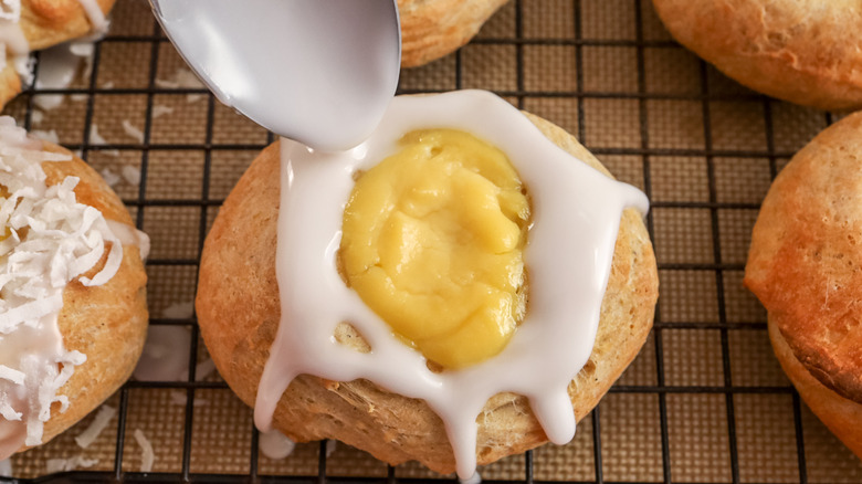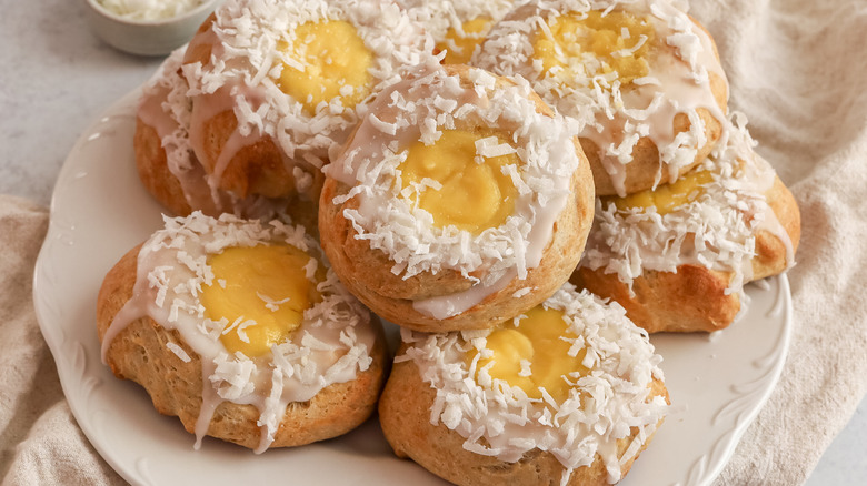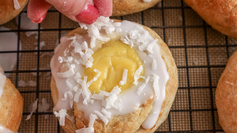 Though skolebrød is a traditional recipe, that doesn't mean you can't change it up a bit. In Norwegian kitchens, the coconut coating isn't considered de rigueur, so it's not uncommon to leave it off or switch it up with another topping. Morone says, "For a refreshing twist, replace the traditional vanilla custard with tangy lemon curd and top the icing with lemon zest instead of coconut. And a chocolate variation can feature a rich cocoa-infused custard, drizzled with chocolate ganache, and sprinkled with chocolate shavings"