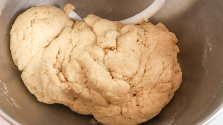 - Add the egg, warm milk, and butter, and knead the dough for about 10 minutes, until it is smooth and pulls away from the sides of the bowl.