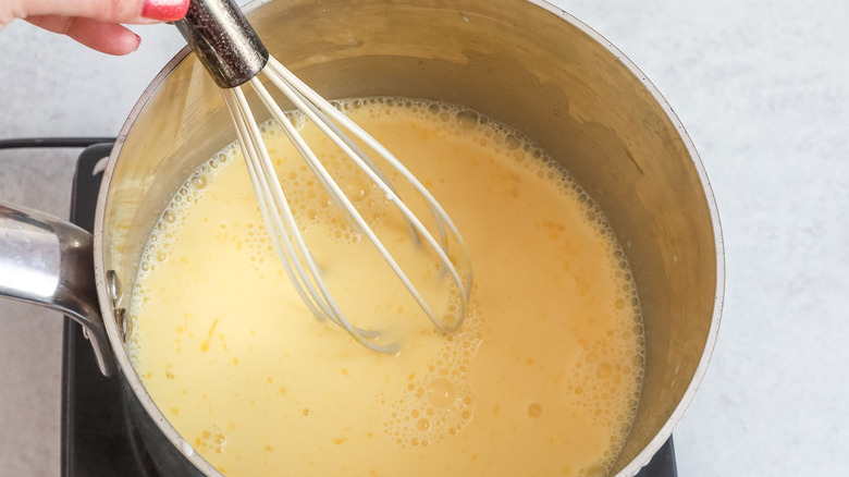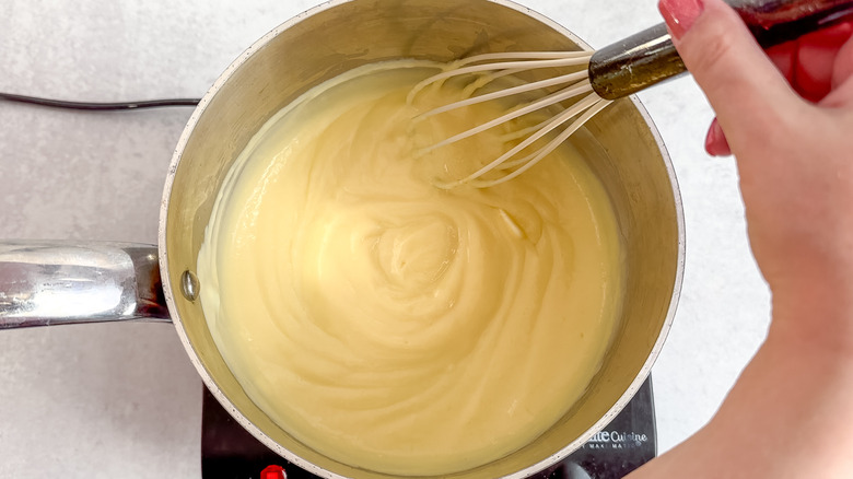 - Heat the mixture over medium-low heat while whisking until it begins boiling, then boil for about a minute until the mixture is thick.