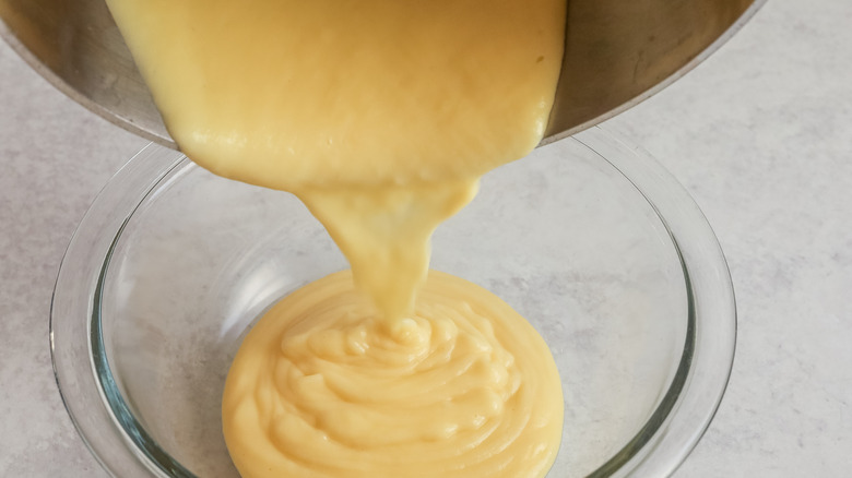 - Pour the pastry cream into a small bowl, place plastic wrap on the surface of the warm custard (this keeps it from getting a skin), and refrigerate until you're ready to use it.