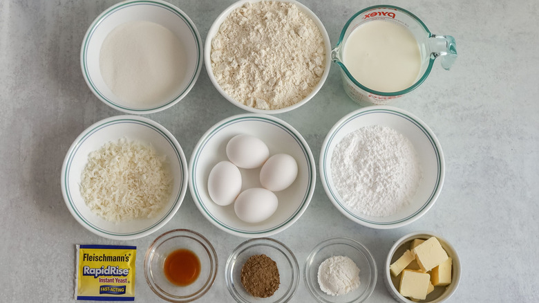 The sweet bread itself is made from all-purpose flour, instant yeast, sugar, cardamom, egg, milk, and butter. For the filling, you'll need extra egg yolks, cornstarch, and vanilla; while powdered sugar and shredded coconut help to add the finishing touches.