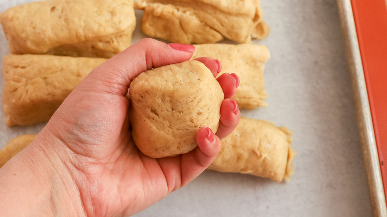 - Gently roll each piece of dough until a smooth ball forms and place the balls on the prepared baking sheets.