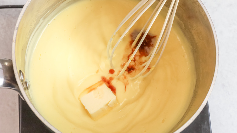 - Remove the pan from the heat, add the butter and vanilla, and stir until smooth.