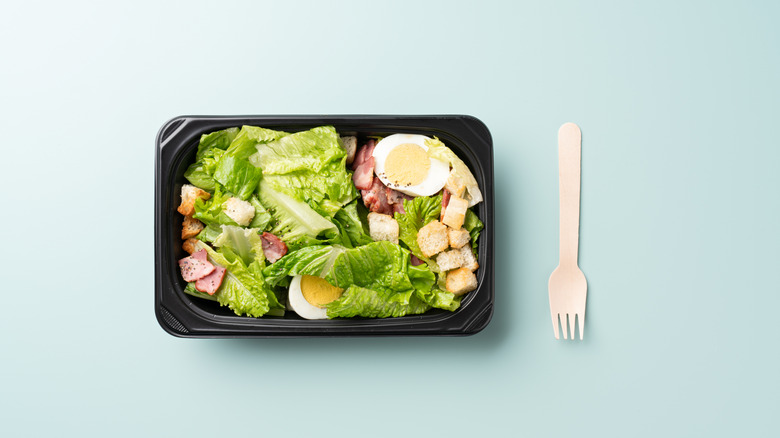 Delicate greens, like most lettuces and mesclun mixes, are already flimsy, and tossing them with dressing makes them wilt even faster. That's especially true of thick and heavy dressings like Caesar or ranch, which make things worse by flattening greens with their physical weight. There are some pretty well-established ways to work around this, starting with packing your dressing separately in its own container. Another option is switching to sturdier greens and creating lettuce-free salads that will let you add the dressing ahead of time.