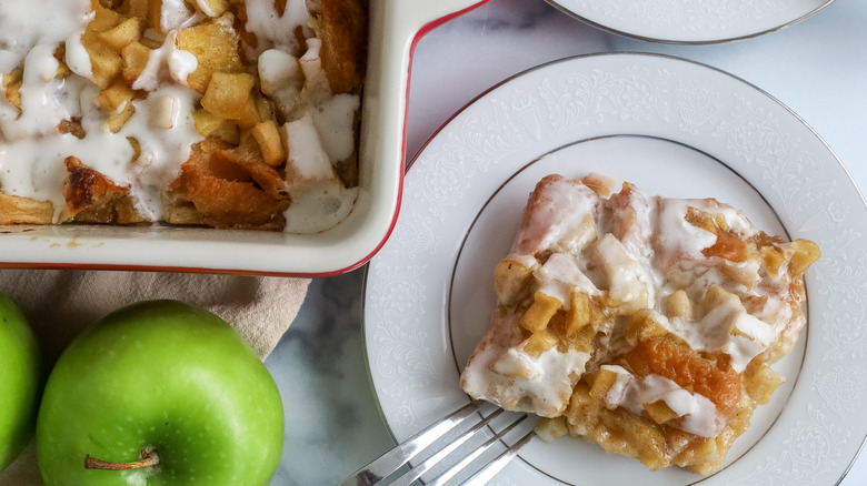 Warm, cozy, spiced, and subtly tart thanks to the clever use of Granny Smith apples, this apple fritter casserole would make a wonderful addition to any breakfast potluck. Like many sweet breakfast casseroles that rely on some sort of bread as the base, this one uses croissants (grocery store croissants will work just fine) as the carby base, along with additions like heavy cream, applesauce, and cinnamon for a flavor boost. Spiced apples go on top, and the whole casserole is topped off with an extra touch of sweetness in the form of a simple glaze.