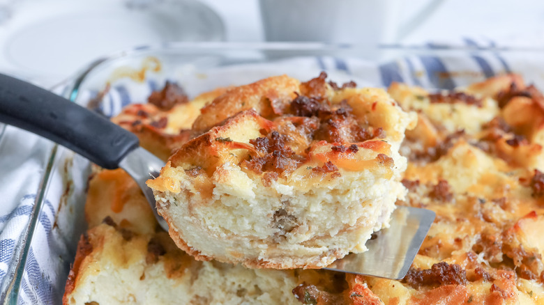 If you've got some croissants sitting around that you forgot about, don't kick those stale pastries to the curb — use them as the base of this croissant breakfast casserole instead. Following the same logic as using stale bread for Thanksgiving stuffing, stale croissants help this breakfast casserole maintain its shape and integrity without turning to mush, something your potluck guests will no doubt be grateful for.