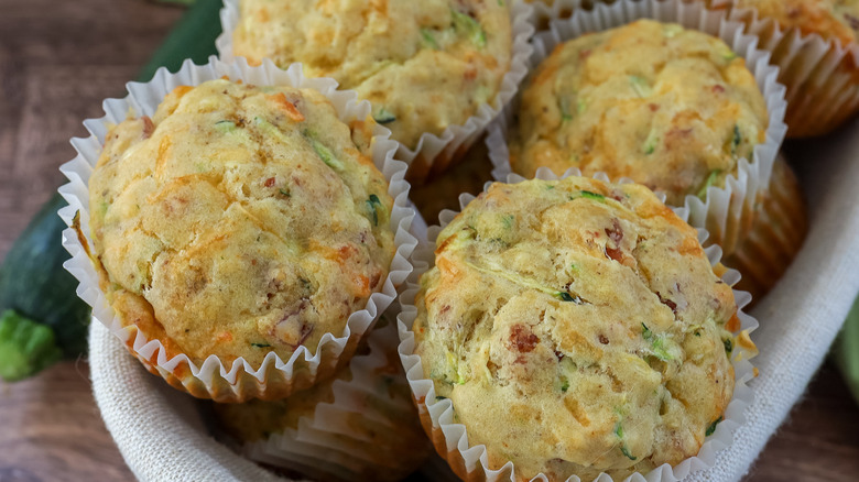 It's easy to load baked goods with a healthy green vegetable, thanks to zucchini. The squash, often considered a vegetable but technically a fruit, doesn't really affect the flavor of baked goods that it graces, but it still imparts a nice nutritional boost, not to mention plenty of moisture. There's classic zucchini bread, zucchini cookies, and even zucchini brownies; and, thanks to this potluck-friendly recipe, there are cheesy bacon zucchini muffins, too.