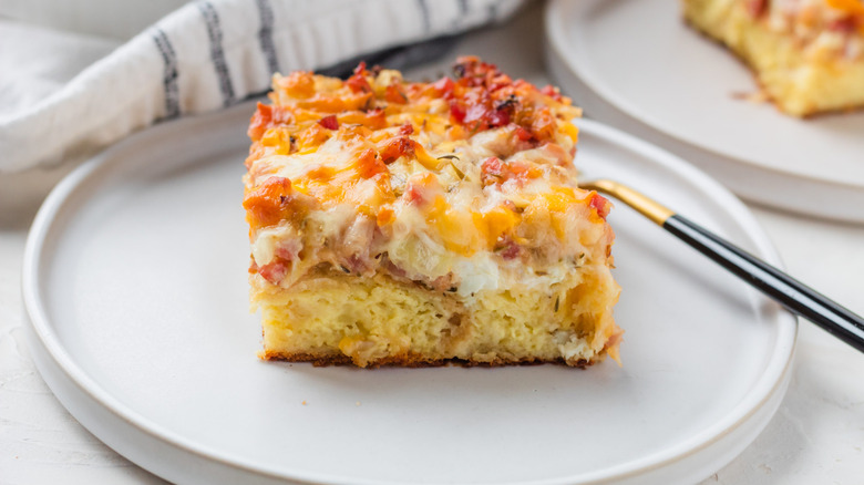 As for the other half of this casserole, it consists of an eggy mixture with cheese, sauteed onions, and pancetta for a unique spin on classic bacon. This recipe yields about six servings, though each portion is pretty big, so you can easily squeeze more servings out depending on how many will be at the potluck.