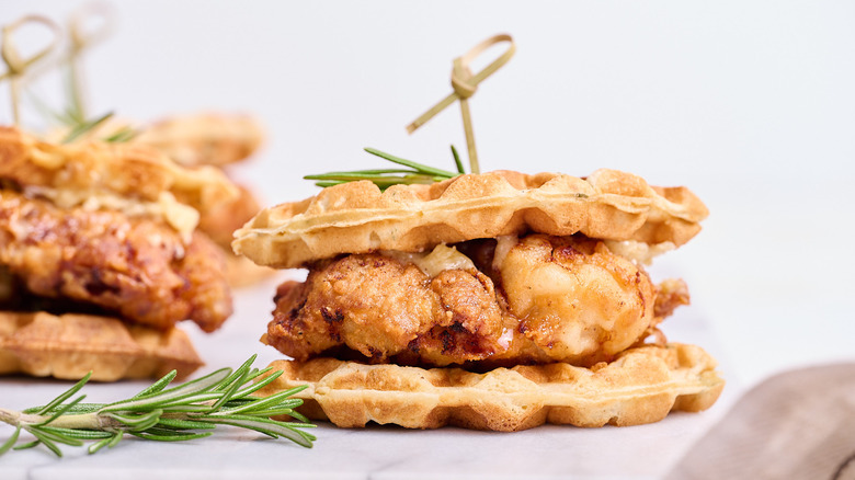 Chicken and waffles may have mysterious origins, but there's nothing mysterious about how good the classic brunch dish tastes. This chicken and waffle sliders recipe reinvents the breakfast staple by transforming it into a succinctly packaged little sandwich, making it a perfect option for serving at a potluck.