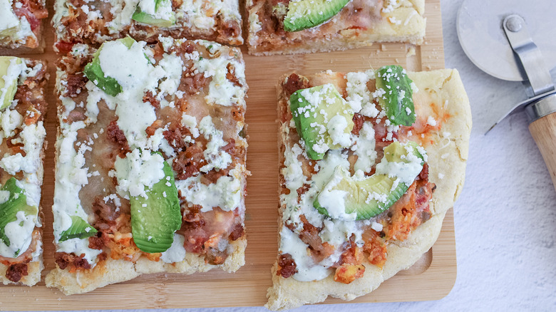 The base of the pizza is a homemade dough, one infused with cornmeal as a nod to a Mexican staple, corn tortillas. Toppings include Mexican chorizo, eggs, salsa, and a cilantro-lime crema. The finished pizza gets topped off with avocado slices and a sprinkling of cotija cheese, not only honing in on the Mexican theme even further, but also adding that special something that really makes this breakfast pizza something special.