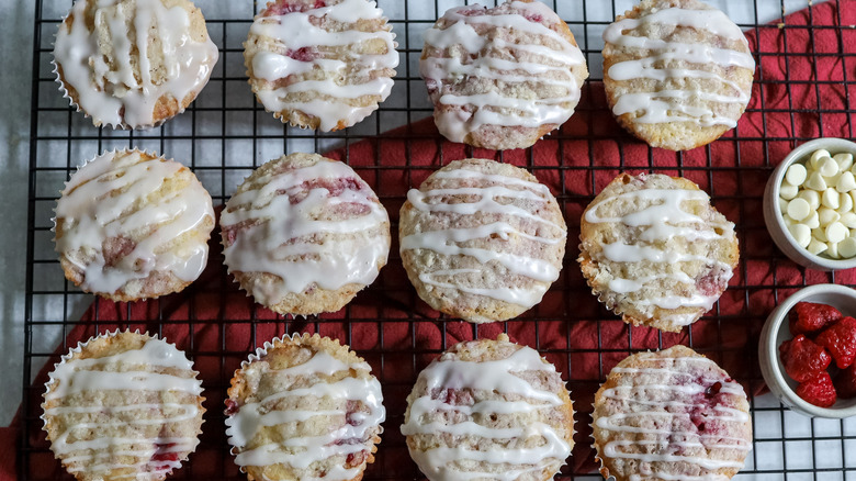 There's something about the combination of ultra-rich white chocolate and tart raspberries that just makes a whole lot of sense. The flavor profiles work exceptionally well together, with the sweet and creamy chocolate offsetting some of the raspeberries' tartness, and vice versa. We see this wonderful flavor duo at play in these raspberry white chocolate chip muffins, which come with a streusel topping and even an optional glaze, should you want to hone in on the sweet nature of the pastry even more.