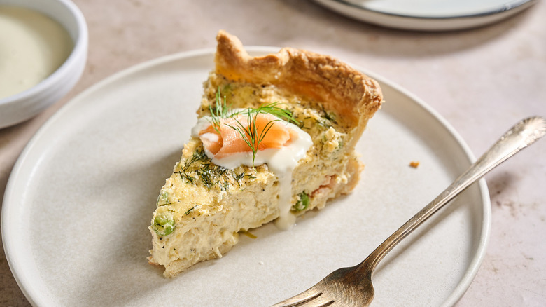 Salmon lox is often paired with bagels, but this recipe pairs it with another breakfast classic: quiche. This smoked salmon and spring vegetable quiche is loaded with ingredients like leeks, peas, and, of course, smoked salmon, all encompassed in that eggy filling that truly makes a quiche what it is. A final garnish of caper-infused crème fraîche, more salmon, and dill help make this quiche look just as sophisticated as it tastes.