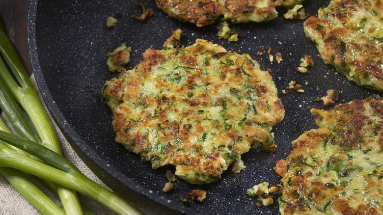 One of my absolute favorite everything-but-the-kitchen-sink recipes is savory fritters. You can really add any vegetable you want to them, as long as they are prepared properly. The great thing about broccoli stems is they grate easily and aren't an overwhelming powerhouse of flavor. Start by peeling those stems and grating them with a standard cheese grater. Mix them in any of your favorite fritter recipes like herby cheddar leek fritters or three-ingredient zucchini fritters.