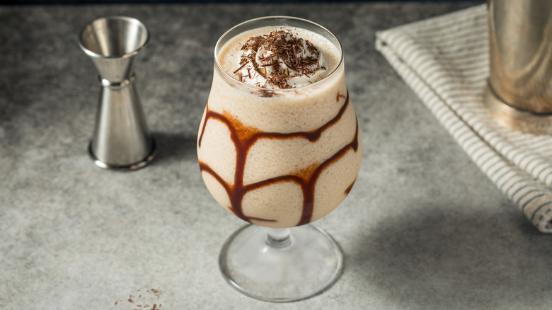 The frozen mudslide, well, slides in between a delicious cocktail and decadent frozen dessert with the help of a blender, a scoop of vanilla ice cream, whipped cream, and a chocolate sauce drizzle. Because these adult milkshakes don't show many signs of restraint in the decadence department, we bartenders always look to top (or over-the-top) each other by substituting frozen mudslide ingredients — like swapping rum or bourbon for vodka, sprinkling in spices, or adding generous smears of Nutella. But the Kahlúa always stays in.