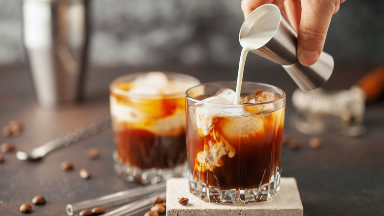 What separates a white Russian from a black Russian isn't exactly black and white. Rather than simply adding the white cream to the ingredients which make up a black Russian, you may need to adjust the proportions to get this drink to taste just right. For a proper white Russian, 2 ounces of vodka and 1 ounce of Kahlúa are required before adding 1 ounce of heavy whipping cream. Bar guests will often ask the bartender to replace the heavy cream with a lighter substitute like whole or 2% milk — and if that's your preference, as they say in the movie, "The Dude abides." But it's the heavy cream that gives the cocktail the thickness and richness it's famous for.