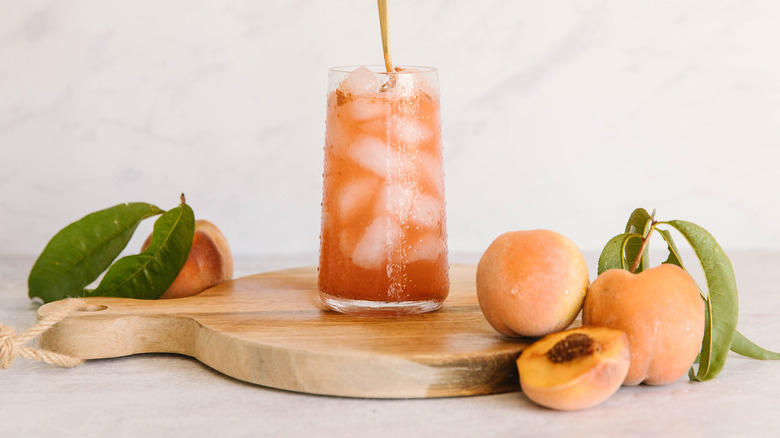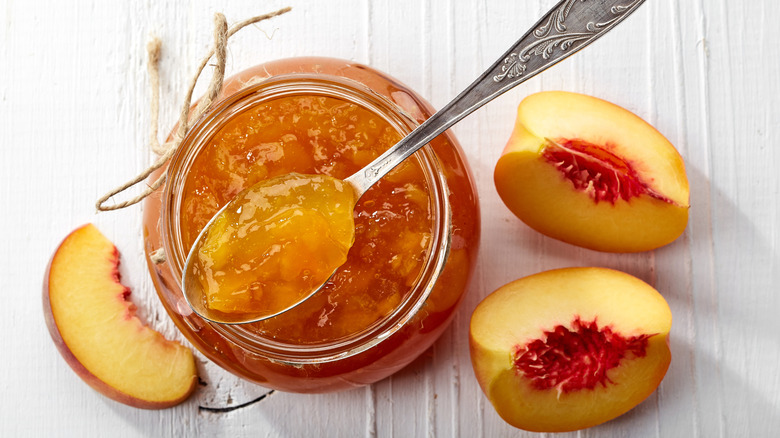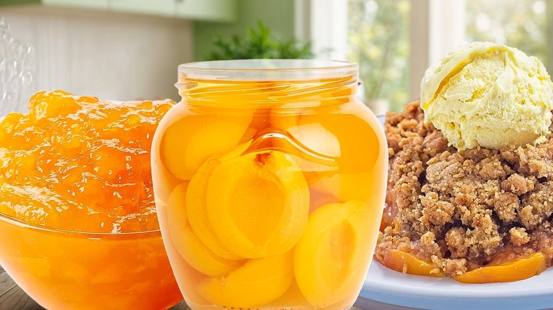 Canned peaches are a quick and easy way to enjoy the fantastic flavors of summer all year long. What's more, a scientific study conducted by the Oregon State University (via PR Newswire) found that canned peaches have an equivalent if not higher amount of nutritional value as their fresh counterparts. If you're fully stocked with canned peaches and are looking for a way to enjoy these conveniently preserved fruits, there are a number of creative uses that involve both sweet and savory applications along with different styles of dishes. Although dessert is most commonly associated with canned peaches, you can just as easily mix them up into a savory chutney, add them to a robust salad, or even muddle them into a mocktail or cocktail. Fling open the doors of your pantry and put those canned peaches to work in your kitchen!