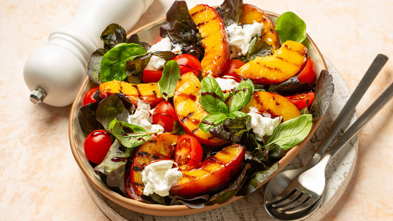 For extra protein, add a small portion of prosciutto, cubed salami, or lardons to your salad. Throwing a handful of fresh basil will bring an earthy green element into play, which would pair especially well with a drizzle of balsamic reduction. All of this together with canned peaches and burrata cheese will come together to create an unbeatable salad recipe that you'll want to keep making all the time. The added bonus of using canned peaches also means that you can do this during any season that you wish.