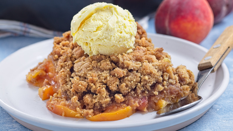 Characterized by a crumbly streusel topping, there's little better than the gooey, sweet taste of a peach fruit crisp. Using canned peaches makes an already easy peach crisp recipe even easier, allowing you more time to sit back and indulge in this dessert. Whether you use slices or halves in syrup or juice, the sweetness already present from the canning process means that you don't have to do much to prepare your peaches for adding into the mix. This built-in element of flavor is just one reason why canned peaches are preferable to fresh for streamlining the process of making a fruit crisp from scratch.