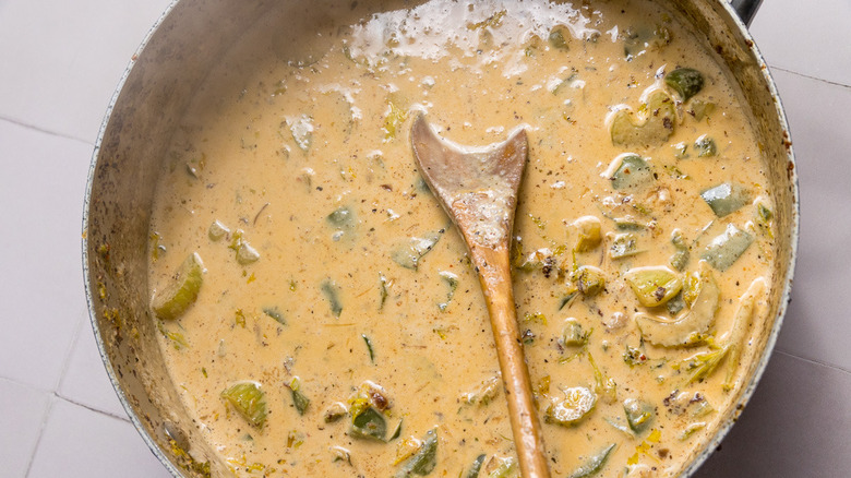 - Add the cream and bring to a simmer.
