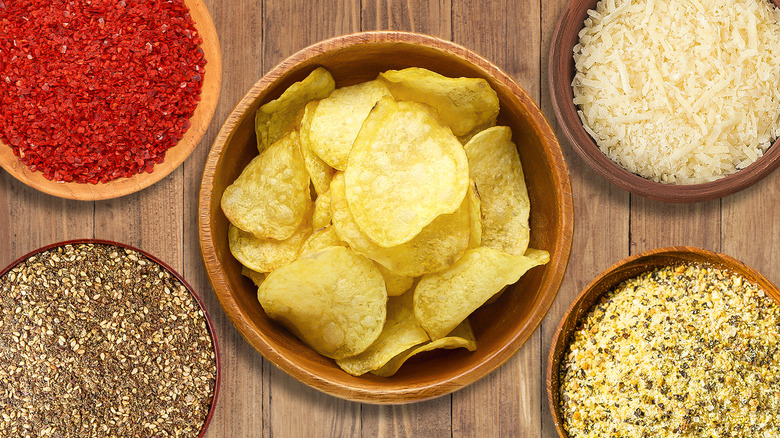 Once you've mastered the art of getting the perfect thinness and the ideal fry, it's time to think about how you're going to season your homemade potato chips. Potato chips, on their own, are quite greasy and one-note, so you'll want to load them up with seasonings to add dimension and flavor. Regardless of which seasonings you choose, always add them while the chips are still hot from the oil, as this will help the seasoning adhere to the surface. Without further ado, let's get snackin'!
