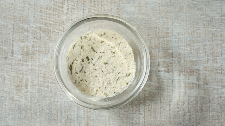 For this potato chip upgrade, you're going to want to grab a container of the ranch dressing powder rather than the bottled dressing itself (which would make your spuds soggy and leave more on your fingers than the chips). You can also make your own homemade ranch powder with powdered buttermilk, dried dill, and other herbs. The buttermilk is what gives these chips an almost creamy mouthfeel, which is not something you'll get to experience with other seasonings on this list. Eat your seasoned chips as-is or pair them with a tasty ranch dip to up the ante.