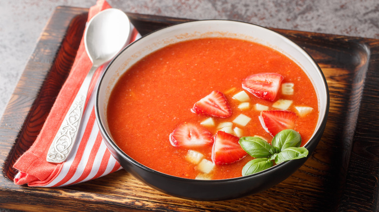 When strawberries join the gazpacho party, they don't ask for much, not even one extra step in the process. They simply join the tomatoes and other fresh produce. Once they are all properly soaked in flavors after marinating, use a food processor or an immersion blender to turn them into a purée. Some recipes go all in with the ingredients, while others reserve some of the fresh fruits and veggies to later use as toppings.