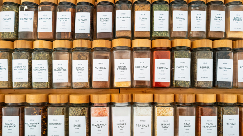 If you go the route of having matching or permanent jars in your spice rack that you refill, then it's worthwhile to look into sourcing bulk spices, rather than buying individual jars. The good news is that buying in bulk doesn't always mean you have to buy a large quantity, as some places allow you to only buy exactly as much as you need. This all lets you customize your spice rack exactly as you see fit. Plus, buying in bulk often saves you money, too — and who can argue against that?