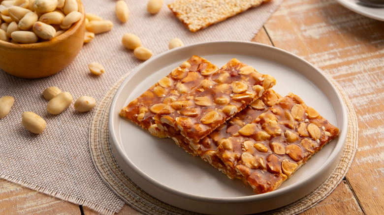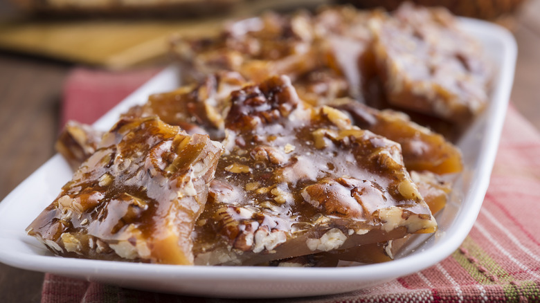 Peanut brittle is a popular American classic that's been enjoyed since the 19th century, boasting many amusing origin stories from a happy accident during routine taffy-making to a river dam made of molasses and peanuts. Classic peanut brittle recipes boil water and sugar syrup followed by baking soda to achieve its namesake crunchy snap. In fact, brittle is often compared to honeycomb candy, its simpler cousin, because they both rely on baking soda and a blend of syrup and sugar to achieve their respective textures. However, new and improved recipes have simplified the ingredients list to a 4-ingredient peanut brittle that's even better than what you can buy at the store.