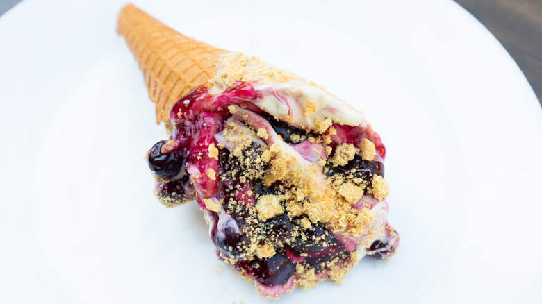 A good cheesecake can make even the most boring, ordinary days feel like a special occasion. All at once, it's rich and creamy, and sweet and tangy — a smooth decadence melting in your mouth. Typically, you would grab a fork and a plate to dig into the wonder that awaits, but this might not be the only way to enjoy cheesecakes. With no-bake cheesecake, in particular, serving the filling in a waffle cone is the unexpected twist that makes it infinitely more fun. It's almost like a 2-in-1 dessert, in which you get both the delight of cheesecake and the handheld convenience of ice cream.