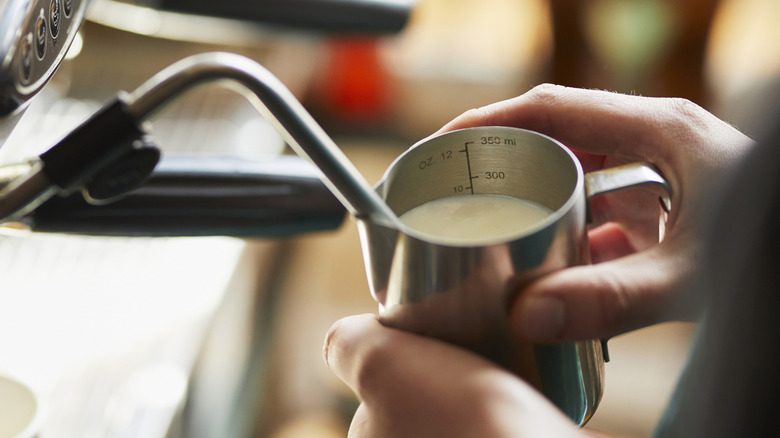 While you can purchase a milk-steaming thermometer like this basic KT Thermo one on Amazon, Choe says, "The best way to make sure you steam milk to the right temperature without a frothing thermometer is to use your hand, touching the side of the pitcher. The milk should be at the right temperature when you can only touch it for a second." This tip comes with the caveat of using the right kind of receptacle to measure the heat by hand. You'll need a jug like this stainless steel Camkyde one for the feel test. Touching the side of the jug and not the bottom of the jug is the best indicator of even heat distribution throughout the milk.