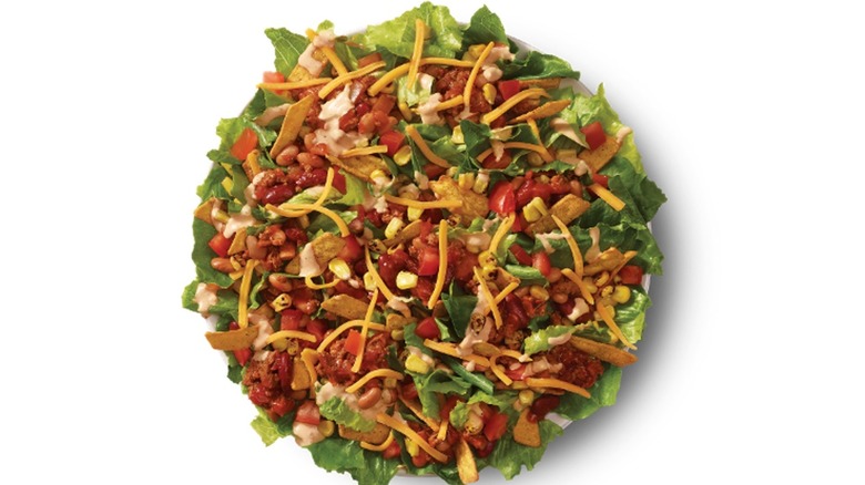 Unfortunately, Wendy's doesn't have any gluten-free alternatives for the buns on its iconic square burgers. You can, however, grab yourself the taco salad as a filling meal. This salad contains romaine lettuce, chili, chili lime seasoned tortilla chips (which are corn based), and is topped with a creamy salsa dressing. This salad is nice and filling, with 500 calories total — making it a complete meal. If you're in the mood for something lighter, there are also many variations of baked potatoes on the menu that are gluten-free as well. For dessert, the famous Wendy's Frosty is a great choice, and it's naturally gluten-free.