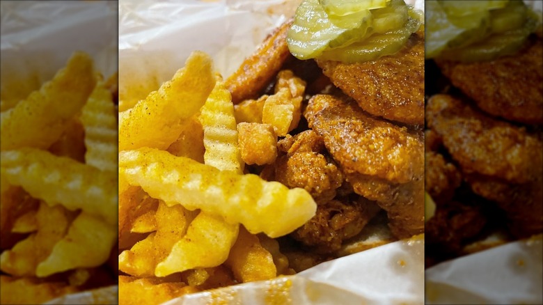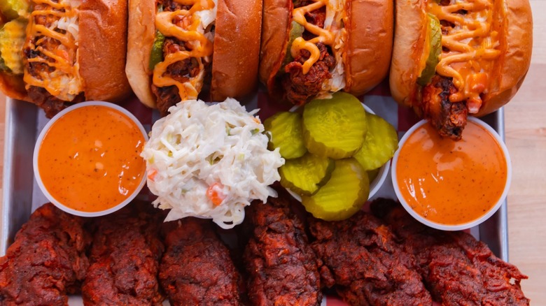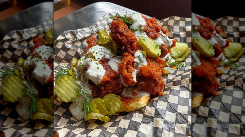 Nashville hot chicken originated, of course, in Nashville, Tennessee. Although it's still considered the hotbed of hot chicken, you don't have to be in Music City to feast upon these superbly saucy birds. A spicy chicken preparation that can feature a wing, thigh, breast, or leg, Nashville hot chicken is classically served with bread and paired with pickle slices. However, whether you're making Nashville-style hot chicken from scratch or having it in a restaurant, online recipes and chefs' interpretations have broadened over time.