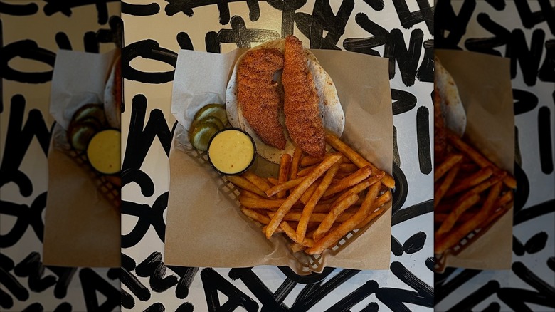 One interesting thing that sets Hot Chicken Alley apart from many other Nashville hot chicken joints is the option of having your dry-rubbed hot chicken tenders wrapped in a warm tortilla. The punny Tender Loving option includes two chicken tenders on fresh, warm tortillas with the classic accompaniments of pickles, french fries, and Alley sauce. You can also bump it up to three wraps by ordering ... wait for it ... the three tenders.