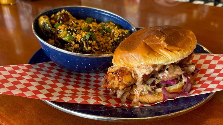 Hot chicken restaurant owner Joe Ford wanted his spot, Hot Chicken Alley, to be located in his own North Phoenix neighborhood — which is, in fact, in an alley. Designed by sister-in-law Raegan Ford, the interior has what she's called an "urban, edgy, and industrial" vibe, which is brightened with humorous chicken-themed photos lining the walls and a colorful custom-painted mural courtesy of Robert Gentile, per Phoenix magazine. Search on Yelp or take a scroll down Google lane, and you'll be hard-pressed to find a review that's not five stars.
