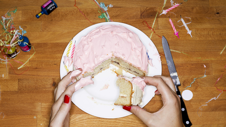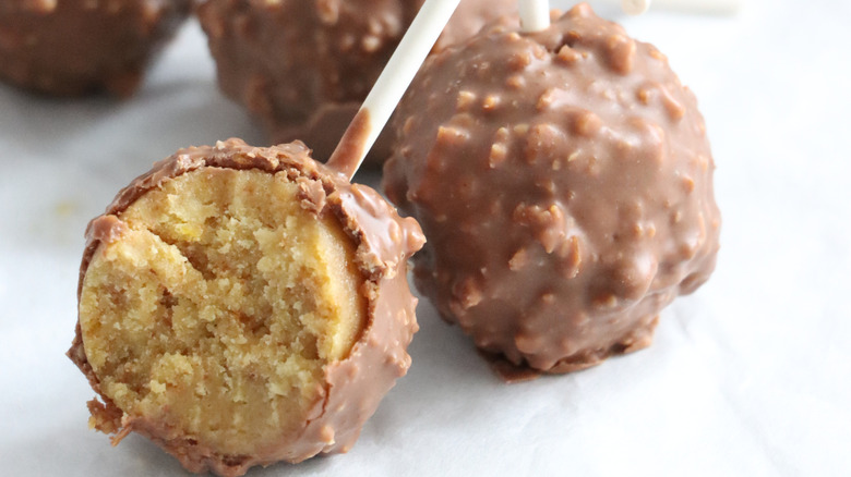 If you go this route, one critical mistake that you need to avoid is stirring the cake into the frosting while it's still warm. Anyone who has decorated a cake before can tell you that warm cake and cold, butter-based frosting doesn't mix. If you combine the warm cake with your frosting, you will risk warming up the fat too much and may even cause the mixture to turn liquidy. This not only makes the cake balls hard to shape and form, but it can also cause issues when you try to stick them with the lollipop sticks and dunk them into the melted chocolate. Your cake should be cool to the touch and easy to handle before you even consider making it into cake pops.