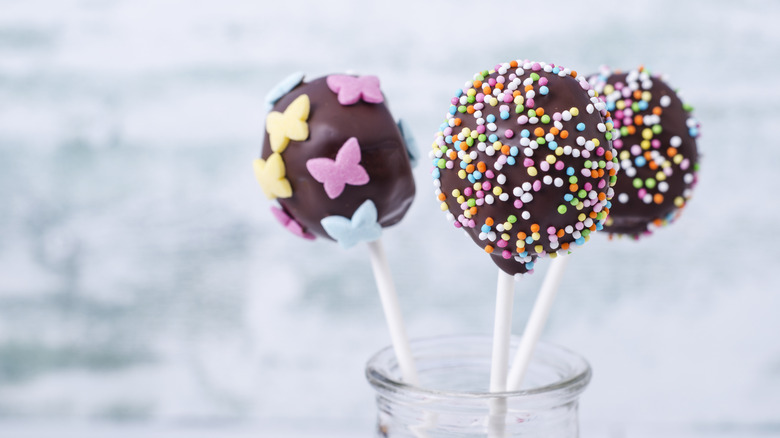 Cake pops are messy — there's no doubt about it. However, there are some things that you can do to make the decorating and drying process a little easier on yourself. For one, you may want to use an egg carton for hassle-free cake pop prep. Once your cake pops have been dipped, you can stick them into the flipped-over egg carton. The cardboard will hold your stick upright and the chocolate can dribble right off and onto the disposable carton. Just make sure that you don't try to lick up any of the chocolate that drips into the carton, as eggshells can be home to salmonella bacteria that can make you sick.