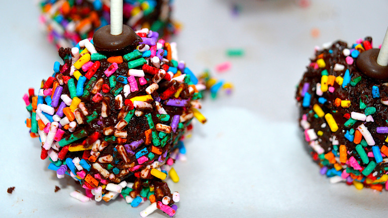 The go-to base for cake pops is the classic white lollipop stick. You can buy a large pack of them on Amazon for relatively cheap, and they have enough strength to hold up your cake pop without even a second thought. But, you can also take the edible route and swap them out for something like a Pocky stick. This Japanese snack is an easy way to upgrade your cake pops, and you can pick between tons of different flavors. They're sturdy, but you just have to be careful not to break it into pieces when you're dipping and drying your pops.