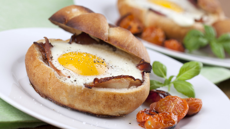 Here's a way to elevate your next brunch: serve baked eggs inside individual bread bowls. Aside from looking adorable on a buffet table, these little morsels will save you a ton of time and are incredibly customizable. Simply buy a variety of small bread rolls, hollow them out, and add your ingredients directly into the holes. Place on a cookie tray or sheet pan and bake in the oven until the eggs are cooked to your desired temperature. That's it! You can follow just about any recipe for baked eggs, substituting the ramekins or muffin tins for the hollowed-out bread rolls.
