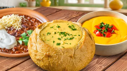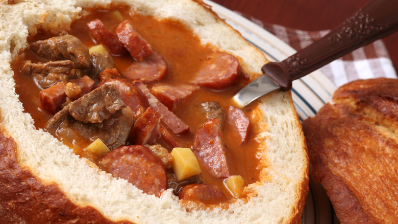 A hearty beef and vegetable stew is a no-brainer for serving inside a bowl of crusty bread, but don't limit yourself to this dish alone; there are other tasty options you can serve in such a way. For instance, try a creamy chicken stew for a different take on a pot pie. Think of recipes that include regional or international flavors, such as a traditional Louisiana-style gumbo or etouffee, a chunky Hungarian goulash, or go with a San Francisco classic: seafood cioppino inside a sourdough loaf.