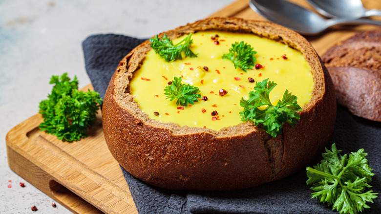 Think of your favorite foods that you enjoy alongside a warm, crusty slice of bread, and you get the idea — simply break off the pieces of bread directly from the bowl as you eat. And depending on the dishes and flavor profiles, you can think outside of the box when it comes to what kind of bread to use instead of the traditional sourdough. Seeded breads, pretzel rolls, pumpernickel or rye loaves, and even gluten-free breads made from alternative grains such as spelt work wonderfully as containers for serving and eating your favorite meals. Here are a few tasty suggestions to get your ideas flowing.
