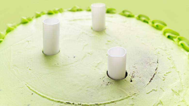 You'll want to use dowels for especially heavy cakes. While cake is edible, it doesn't always make for the best building material — especially if you're scaling upwards and adding a ton of different components, decorations, and tiers. If you neglect to use a dowel (or in the case of a large cake, not enough dowels), you may risk the top layers sinking down and crushing the poor bottom layer.
