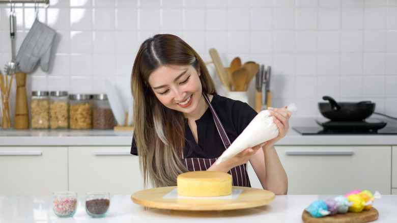 What's not to love about a classic, homestyle layer cake? It's a staple at birthdays and special celebrations, and there seems to be something very special about getting to make one yourself for an event, rather than just going to the store and buying a premade one. But like all bakes, your layer cake can look a little worse for wear sometimes. While single-layer cakes and sheet cakes are pretty straightforward — with sponge, icing, and decorations — layer cakes require a very precise attention to detail. Otherwise, you could be left with a cake that's lopsided, sunken, or like it just walked off the set of "Nailed It!"