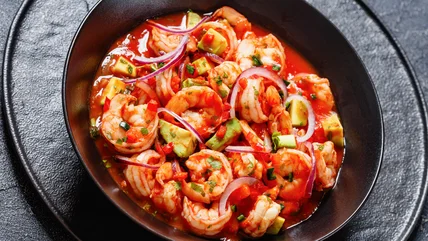 There are two major differences with shrimp cocktails served in Mexico. For one, rather than a thick dipping sauce, the shrimp are immersed in a loose tomatoey wash full of other chunky additions like onions, celery, chiles, or avocados. The second difference is the sauce is probably spiked with a few dashes of Mexican hot sauce rather than horseradish to give it a fiery contrast to the sweet shrimp. Don't fear the heat, as it's an integral flavor component that helps balance the sweet, tomato based sauce.