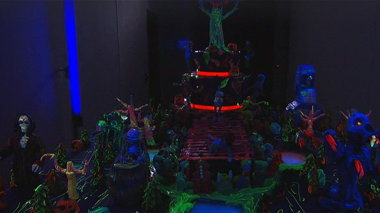 This next cake was the result of a collaboration with a zombie fashion show. The client's biggest requirement? The cake had to react when placed under black lights. A seemingly impossible feat, the team pulled it off with the help of some edible neon paint. The cake featured fashionable skeletons and other eerily on-style ghouls and spooks, and it did indeed stun the audience when shown under the glow of black lights. To complete the ambience, Buddy Valastro and his team also added spooky smoke effects to the already impressive structure.