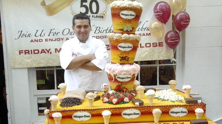 Last but certainly not least is the cake showcasing various Häagen-Dazs flavors that Buddy Valastro and his team made to celebrate the 50th anniversary of the ice cream company's first store location. Surprisingly, this cake didn't actually contain any ice cream, though the cones around the base were indeed real ice cream cones. The cake featured three pints (vanilla, coffee, and strawberry) stacked on top of one another on a huge cake base adorned with ice cream cones, ice cream sandwiches, coffee beans, and strawberries.