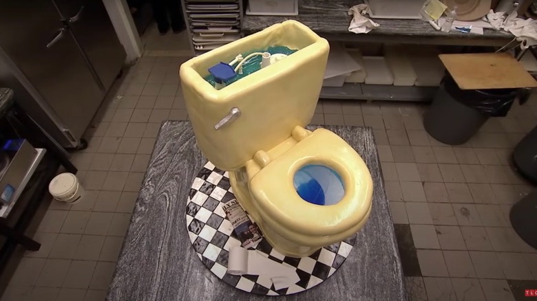 When Buddy Valastro's favorite plumbers were looking for a way to celebrate their 100-year anniversary, they knew they could count on Carlo's Bakery to deliver. Their request was unprecedented: They wanted a vintage yellow toilet bowl cake, and they wanted Valastro to make it flush. Despite his protestations, the plumbers insisted he could pull it off, so of course, he had to take on the challenge. With the help of some clever tubing work, he did indeed manage to make a flushing cake toilet that was a remarkable dupe of the vintage yellow one he'd been shown. It was everything the plumbers had asked for, and they were delighted when it actually flushed.